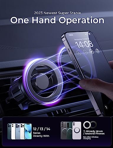 - 👍Directly with iPhone 14/13/12/mini/pro max Car Accessories, Won’t Block Wireless Charging, for magsafe case car holder without additional magnet metal plate. Just get close and automatically snap to the magnetic air vent car mount for iPhone fits magsafe, enjoy Hands-free keeping your phone firmly! Work for All Android Phones: We provide extra 2 metal rings, fits other iPhone case and Android phones without magsafe