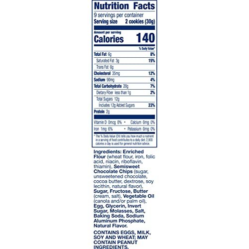 Details: Pillsbury Soft Baked Chocolate Chip Cookies are made with real chocolate chips and a blend of butter and shortening for the perfect soft baked texture. All the flavor and goodness you expect from Pillsbury cookie dough in a ready to eat cookie. These cookies are the perfect lunchbox treat or after school snack your whole family will enjoy! Enjoy your favorite Pillsbury flavors without turning on the oven! These ready to eat cookies are the perfect on-the-go treats or afternoon snack for your family. Try all Pillsbury Soft Baked Cookies including: Chocolate Chip, Confetti, Butterscotch & Chocolate, Drizzle Sugar, and Peanut Butter with Chocolate Drizzle. Contains 18 Soft Baked Cookies in total.