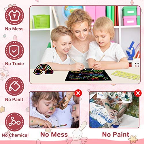 - 🍎🍬Superior & Safety Art Paper: 🎁No ink, no messy & non-toxic, these magic scratch papers made of premiun paper, thick, smooth and safe for kids. Inspire the infinite the imagination and creativity of your children without any harm and mess; Perfect toy gift for girls 3 4 5 6 7 8 9 10 11 12 year old