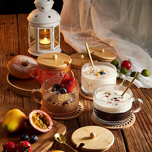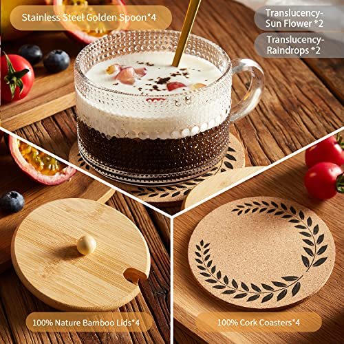 - YOU WILL GET: 4 vintage coffee cups(4 Translucent cups with embossed sunflower and raindrop patterns), 4 unique natural bamboo covers, 4 stainless steel spoons, and 4 cork coasters. This practical combination caters to your daily needs