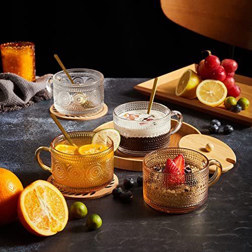 Tekuve Vintage Glass Coffee Mugs Set of 4, Clear Embossed Tea Cups, Coffee Bar Accessories, Iced Coffee Cups with Bamboo Lids and Spoons for Overnight Oats, Yogurt, Cappuccino, Latte(4T)