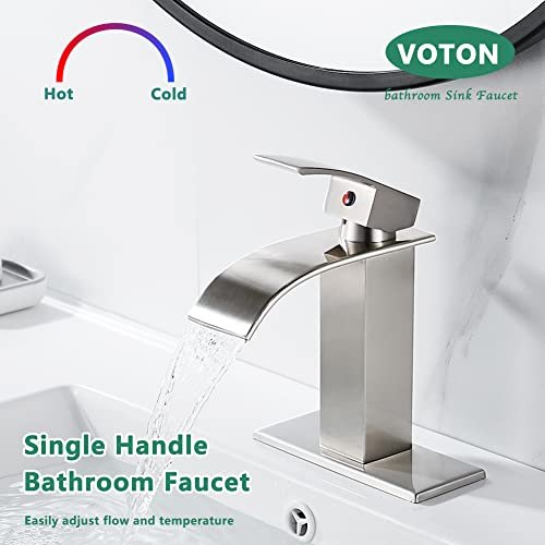 VOTON Waterfall Spout Single Handle Bathroom Faucet Brushed Nickel Commercial Modern Lavatory Tap with Pop-up Drain