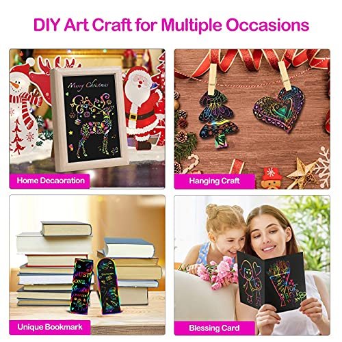- 🌈🍒Great Value Scratch Paper Art Set: 🍓Scratch magic paper come with 50 sheets scratch sheets and 5 wooden stylus can meet your needs. you can use the stylus to scratch away to reveal the beautiful rainbow background. Let kids make outstanding handmade artworks, and keep boys and girls busy with fun DIY kids art craft project